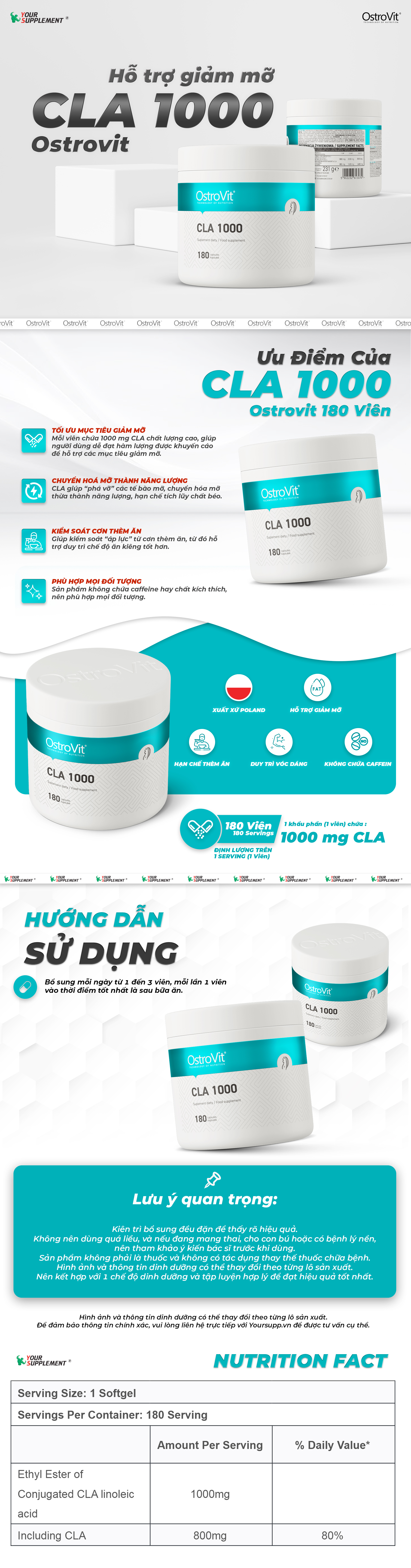 OstroVit CLA 1000 (180 viên) là thực phẩm bổ sung chất lượng cao nhập khẩu từ Ba Lan, chứa axit linoleic liên hợp (CLA) với hàm lượng mỗi viên lên tới 1000 mg.