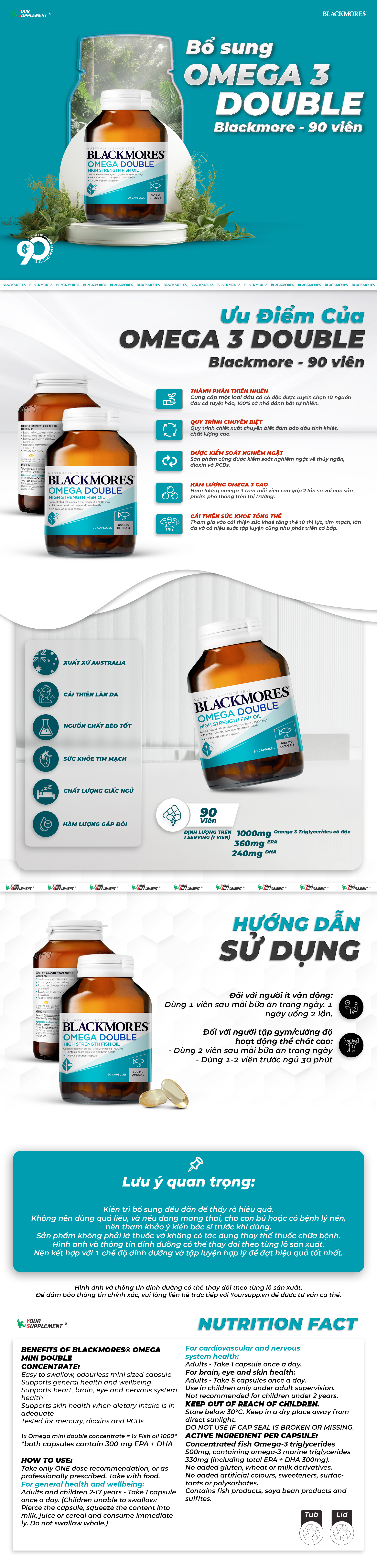 Blackmores Omega Double High Strength Fish OiI là dầu cá cô đặc, chất lượng cao, cung cấp gấp đôi hàm lượng omega-3 trong mỗi viên nang so với dầu cá thông thường, để duy trì sức khỏe của tim, da, mắt và não.
